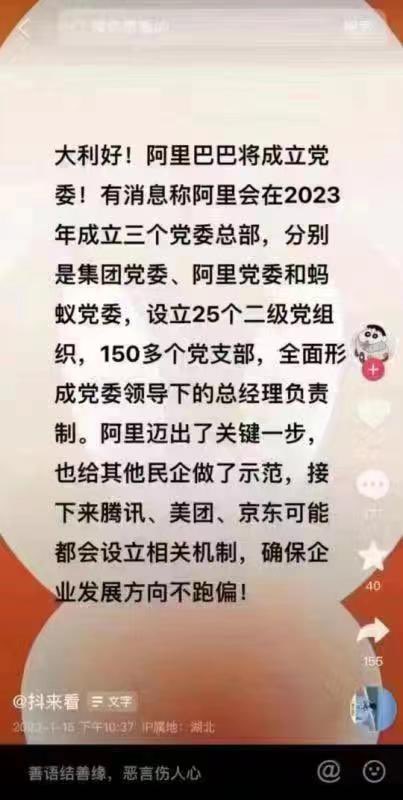 阿里将成立党委总部 消息称,阿里会在2023年成立三个党委总部】分别是集团党委、阿里党委和蚂蚁党委,设立25个二级党组织,150多个党支部,全面形成党委领导下的总经理负责制……接下来腾讯、美团、京东可能都会设立相关机制